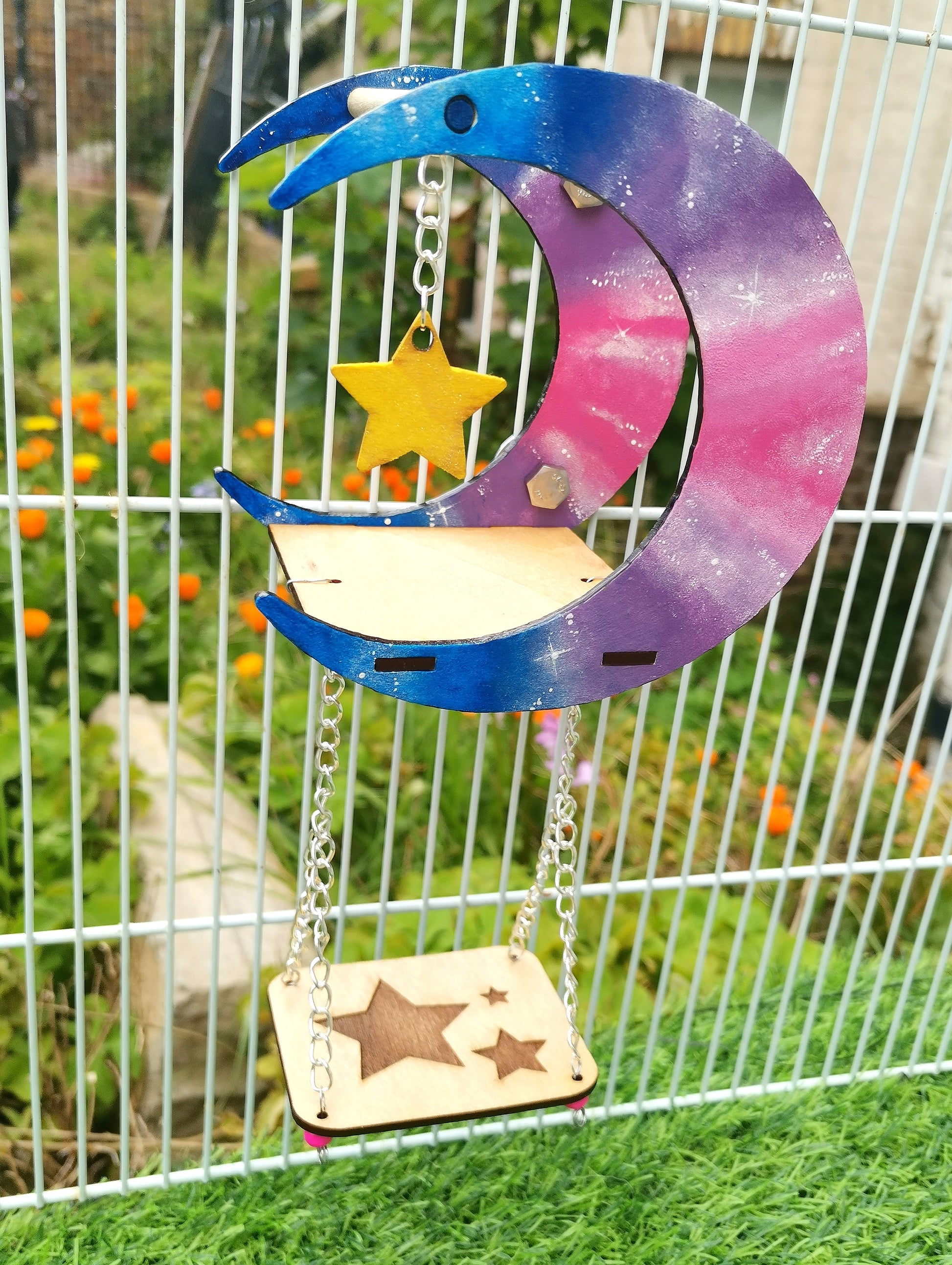 This custom painted ledge has a cute (food dyed, safe to Chew) star that dangles above the platform, underneath is an engraved swing that your little critter would love sitting on watching the world go by ~